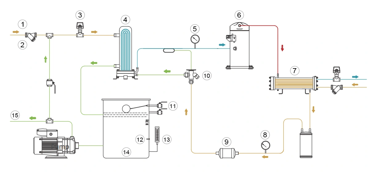 - المبخر: نوع غلافي أنبوبي (غلاف من الفولاذ المقاوم للصدأ + أنابيب نحاسية سن داخلي)